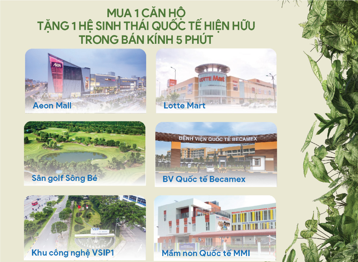• Y tế: Dễ dàng tiếp cận BV Quốc tế Becamex, BV Quốc tế Hạnh Phúc, BV Columbia Asia.