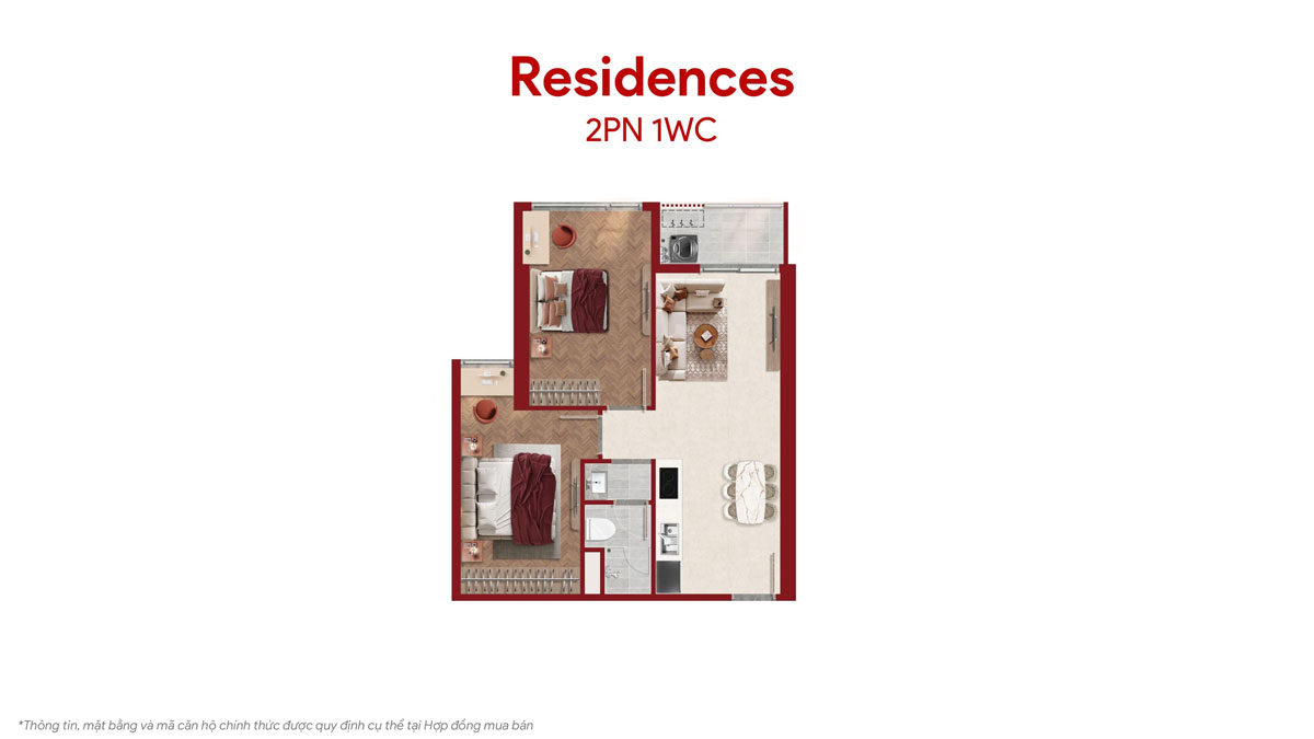 | Căn hộ 2PN (63-68m2) | Không gian rộng rãi, ban công thoáng, tối ưu ánh sáng tự nhiên, đáp ứng nhu cầu an cư gia đình hiện đại. |